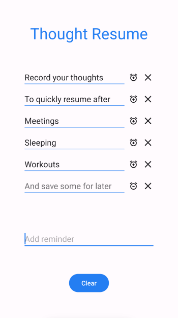 Thought Resume Visit GitHub repository Native App Android Kotlin Record your thoughts to quickly resume what you were doing after meetings, sleeping, outings, or anything else! Available for Android.